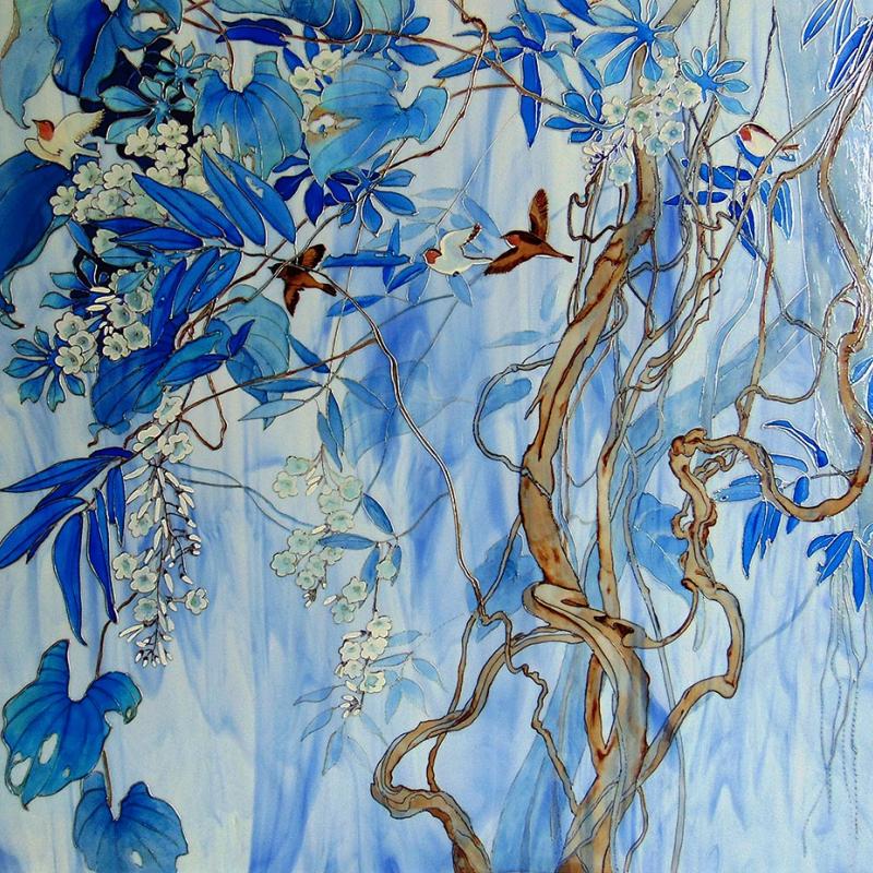 Витражная роспись по стеклу "Голубые лианы". Картина